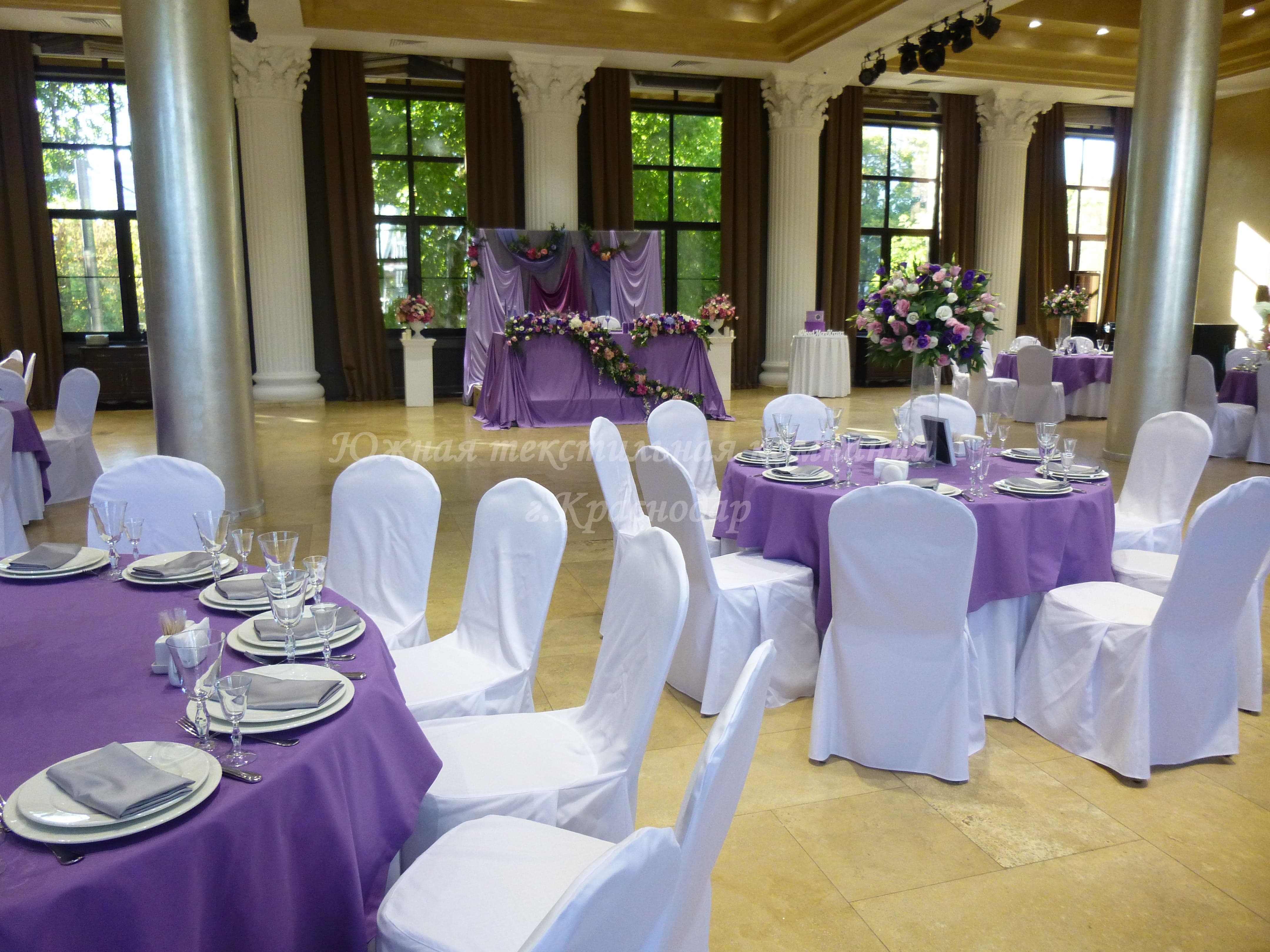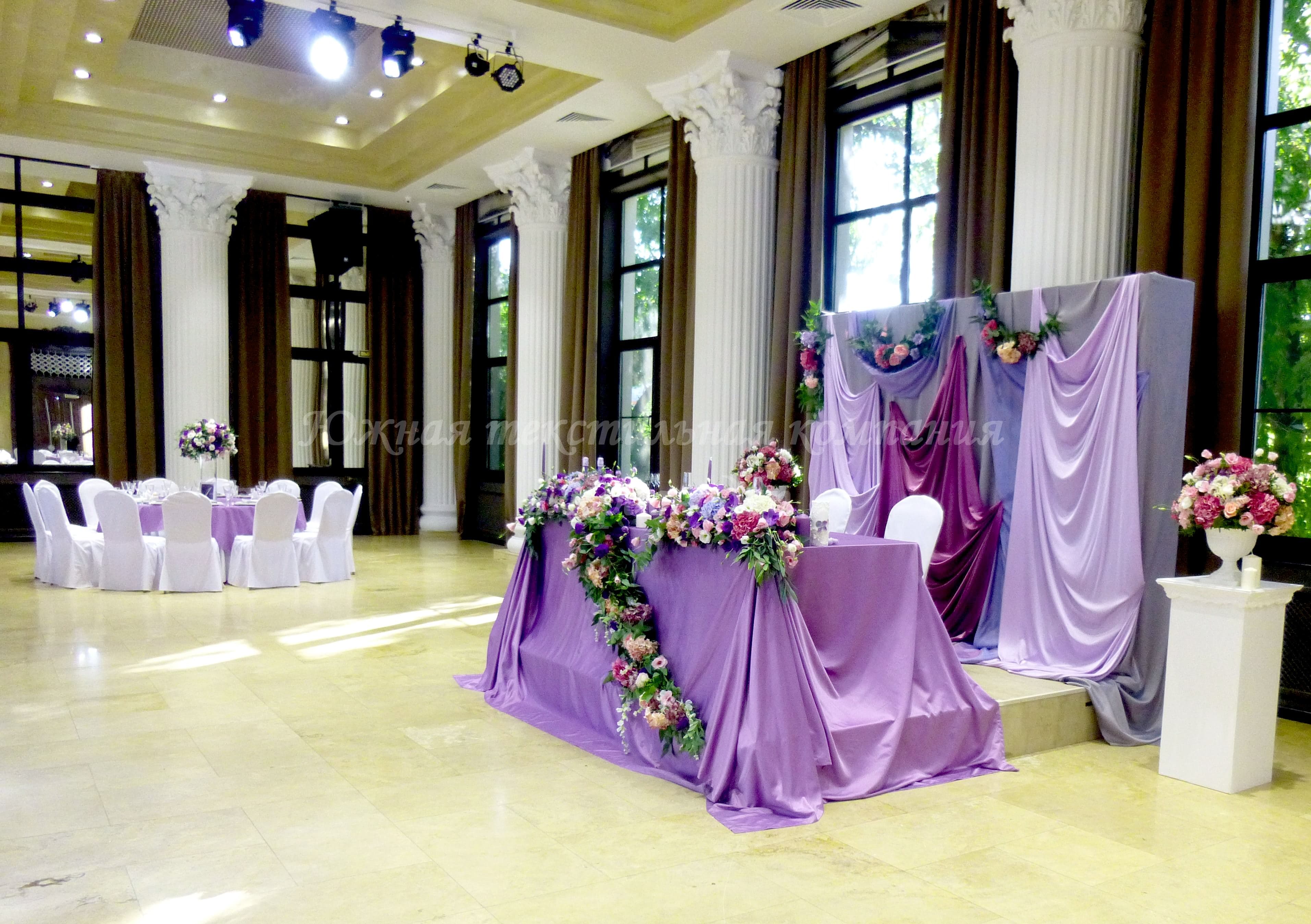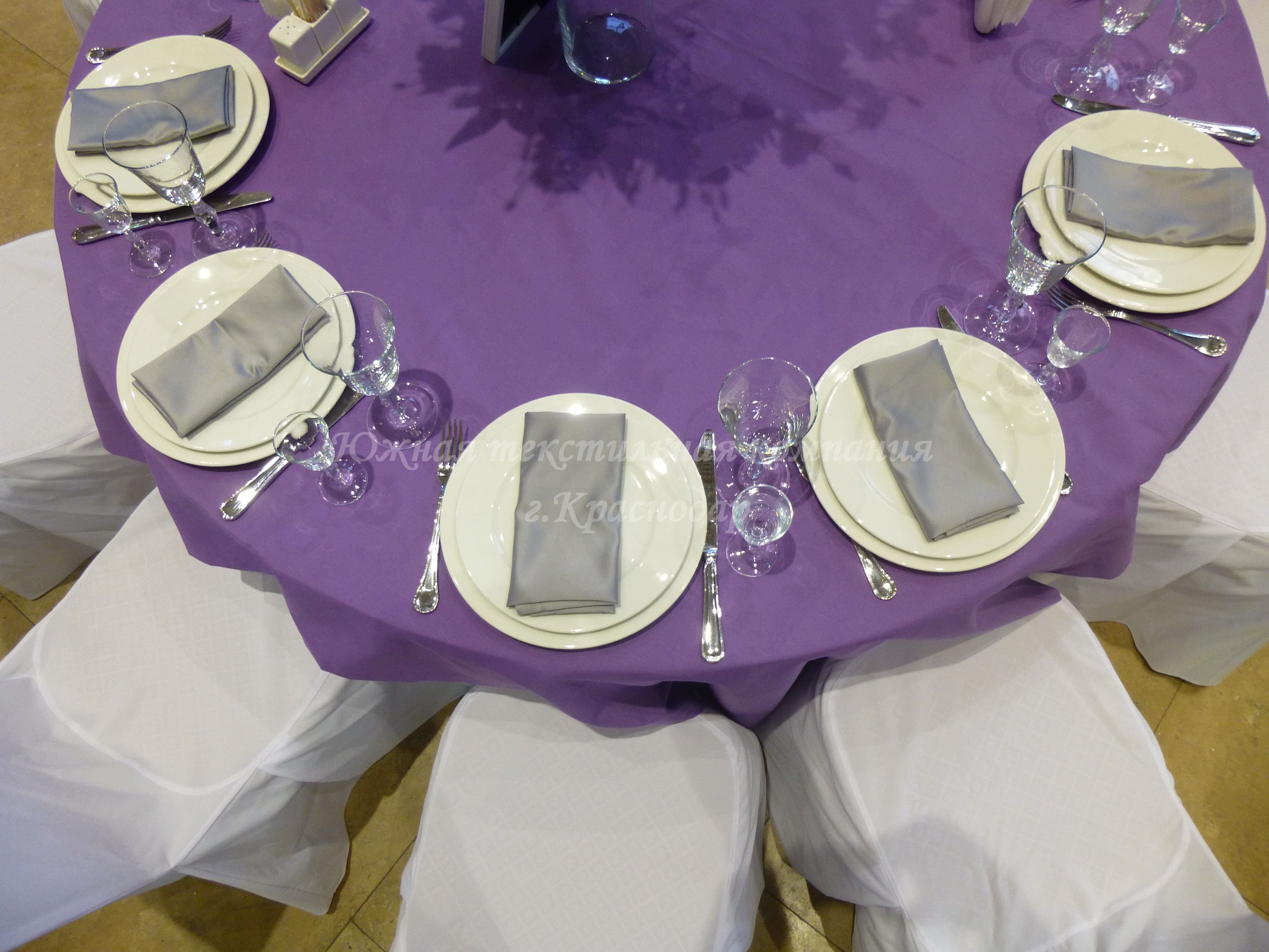 Для свадебного приёма Юлии и Артёма наша компания сшила сиреневые напероны, серые салфетки, скатерть на кэндибар и скатерть на стол молодожёнов.