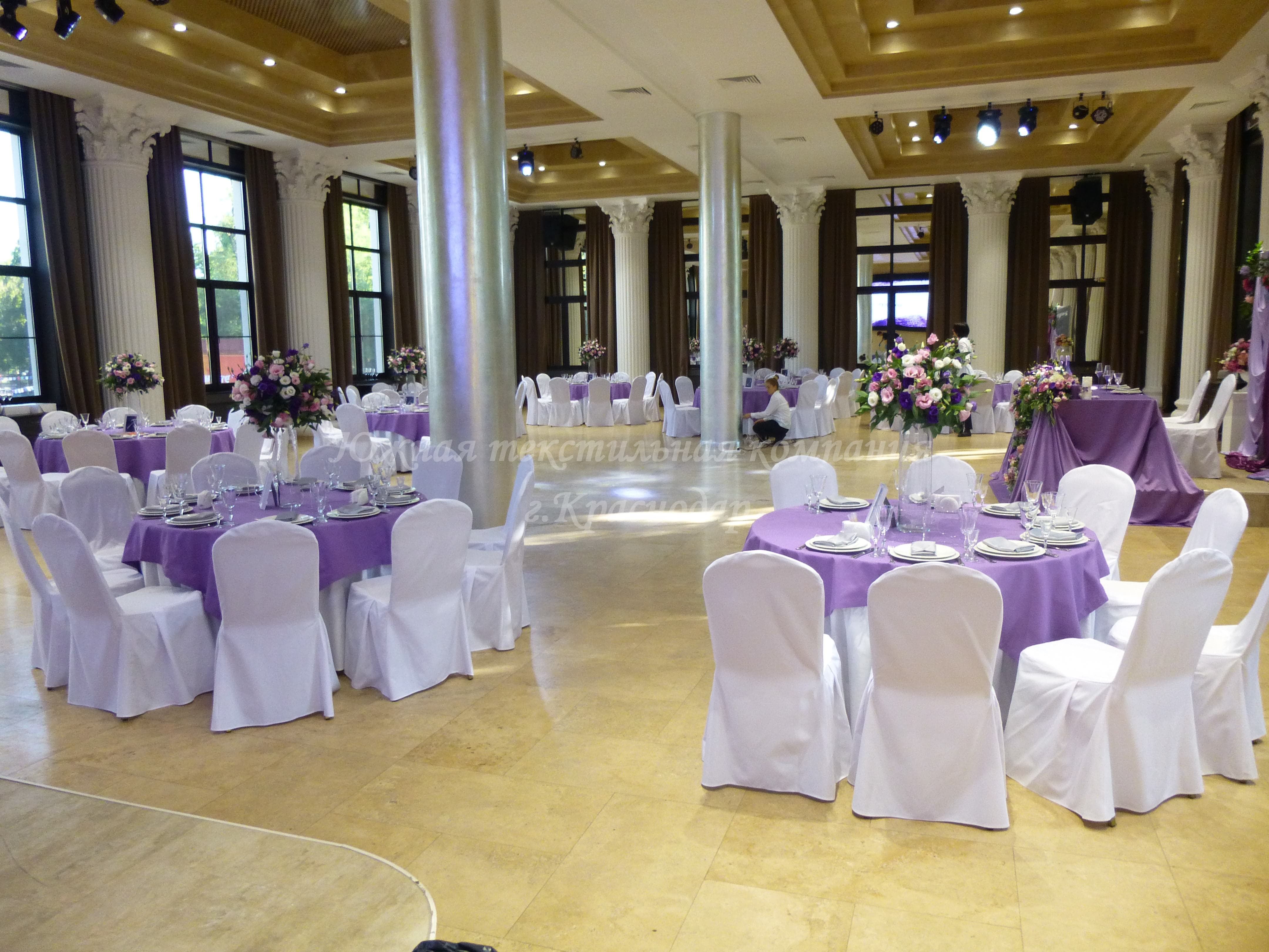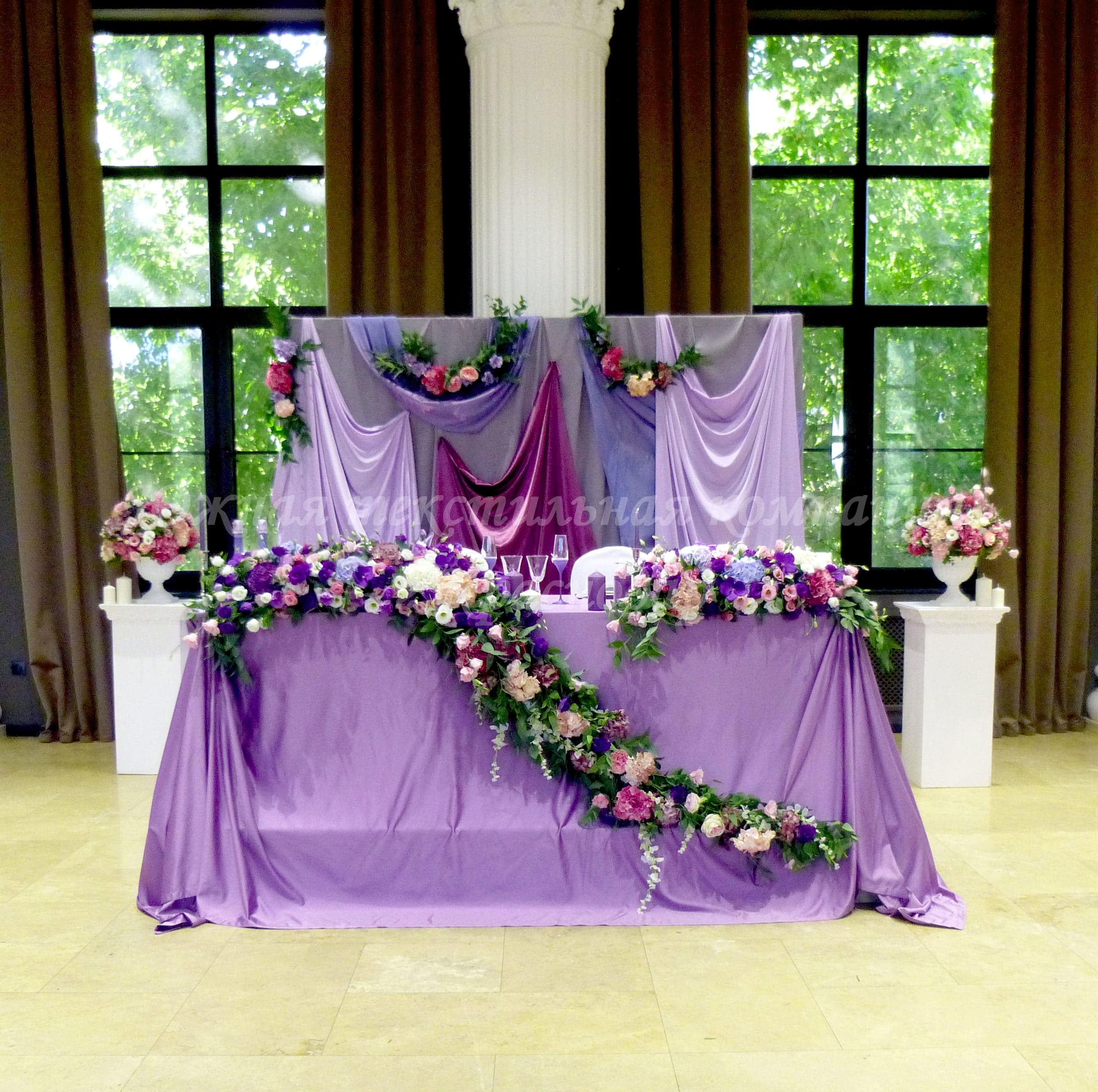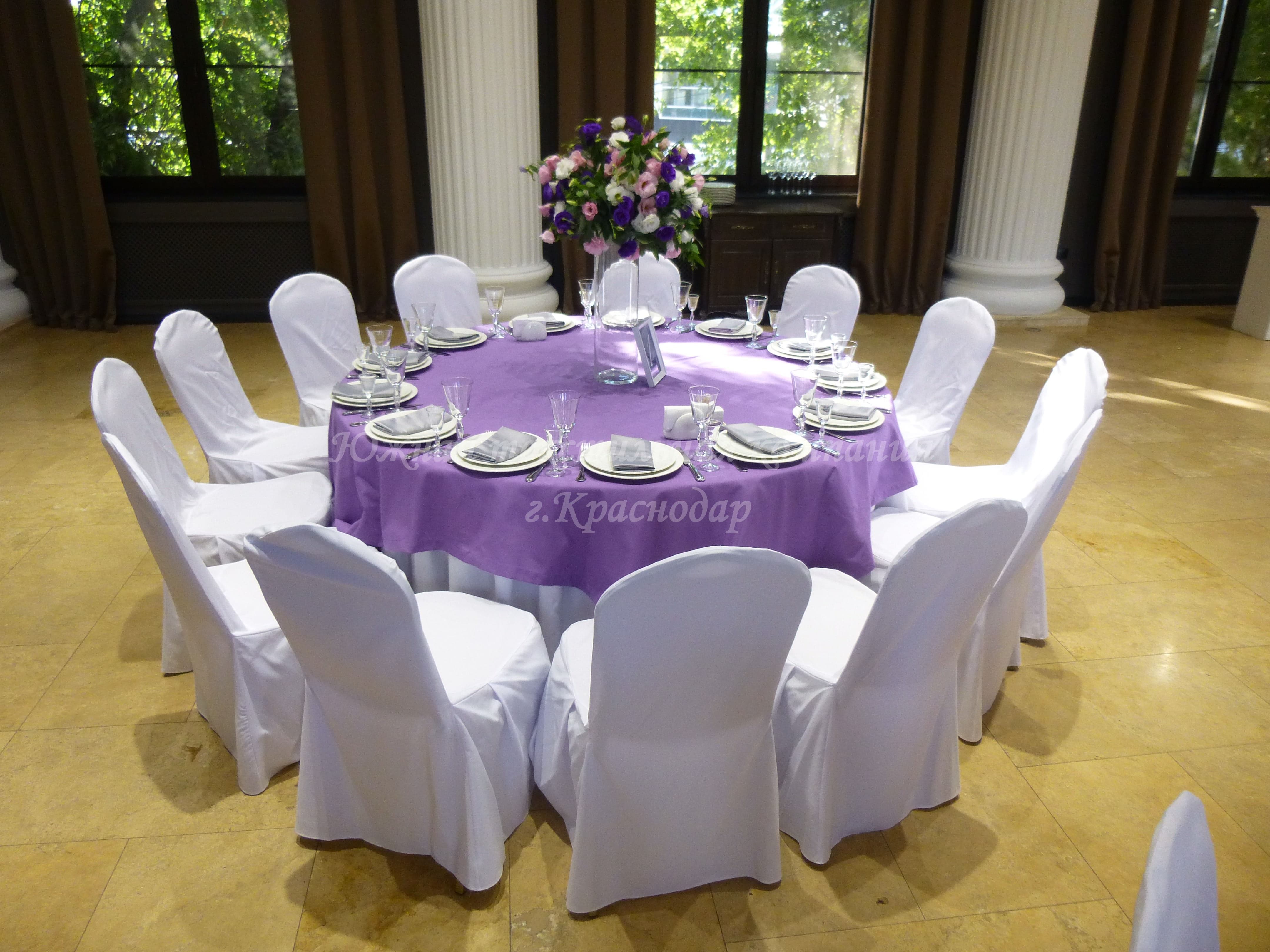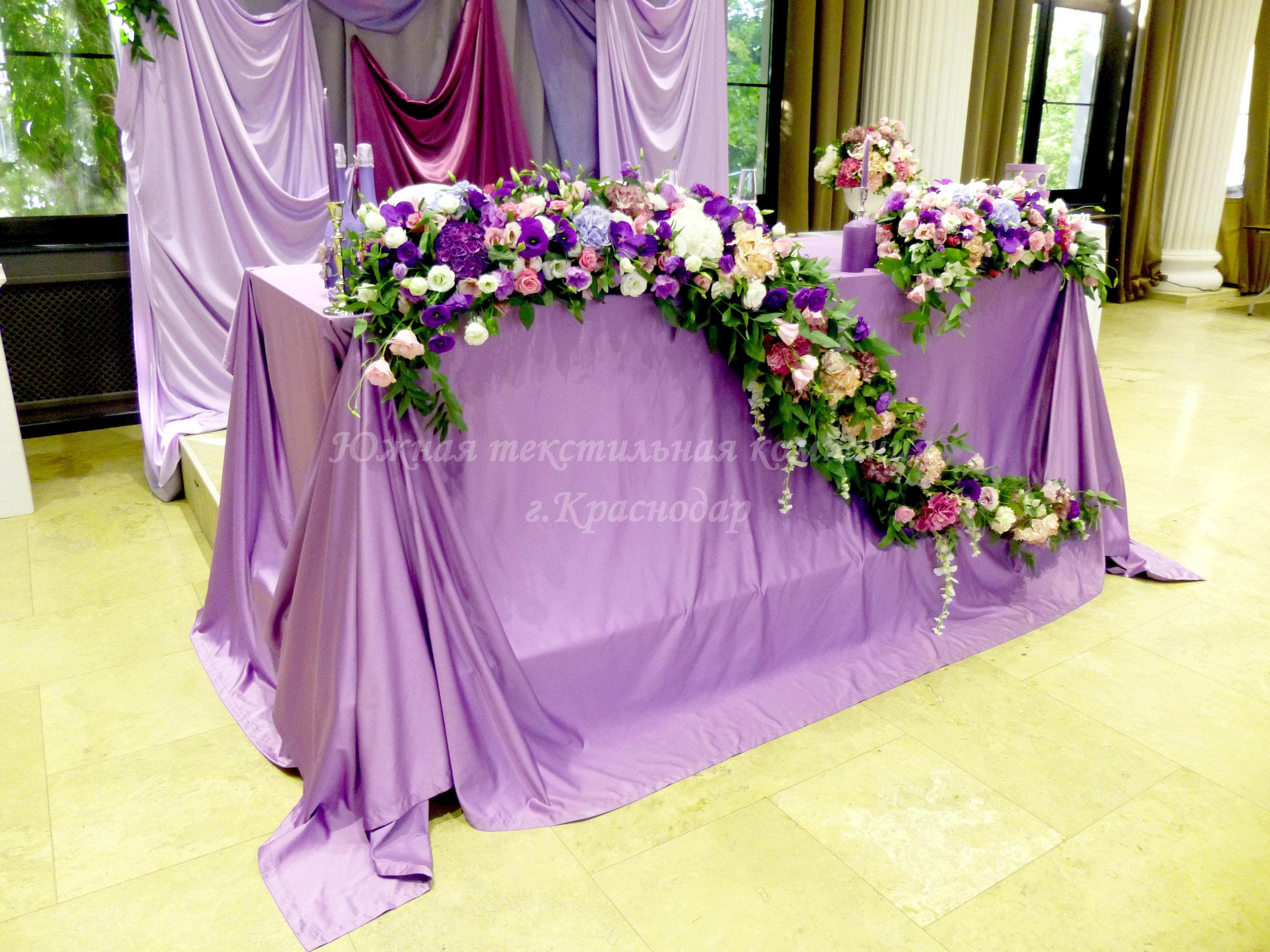 Для свадебного приёма Юлии и Артёма наша компания сшила сиреневые напероны, серые салфетки, скатерть на кэндибар и скатерть на стол молодожёнов.
