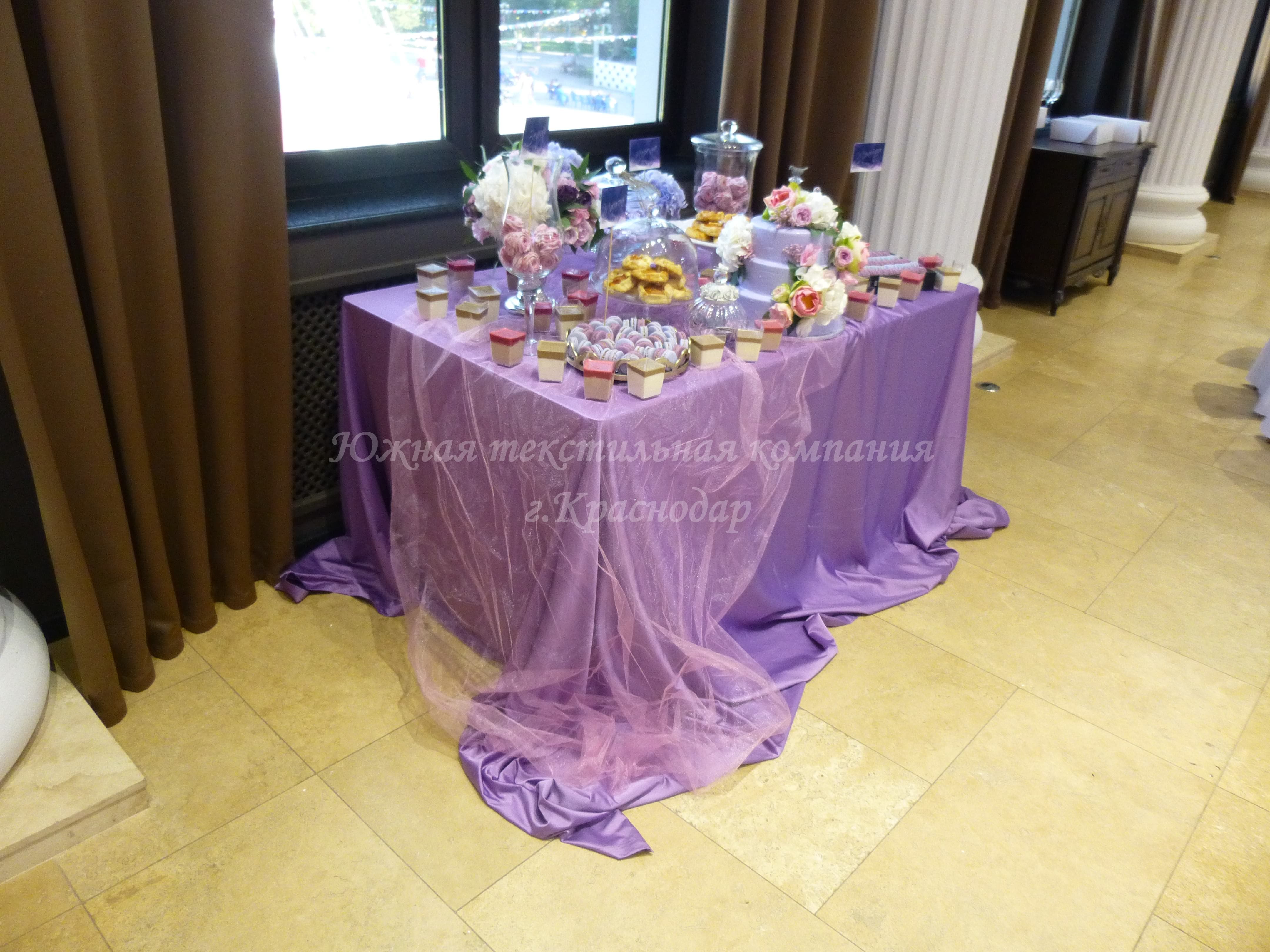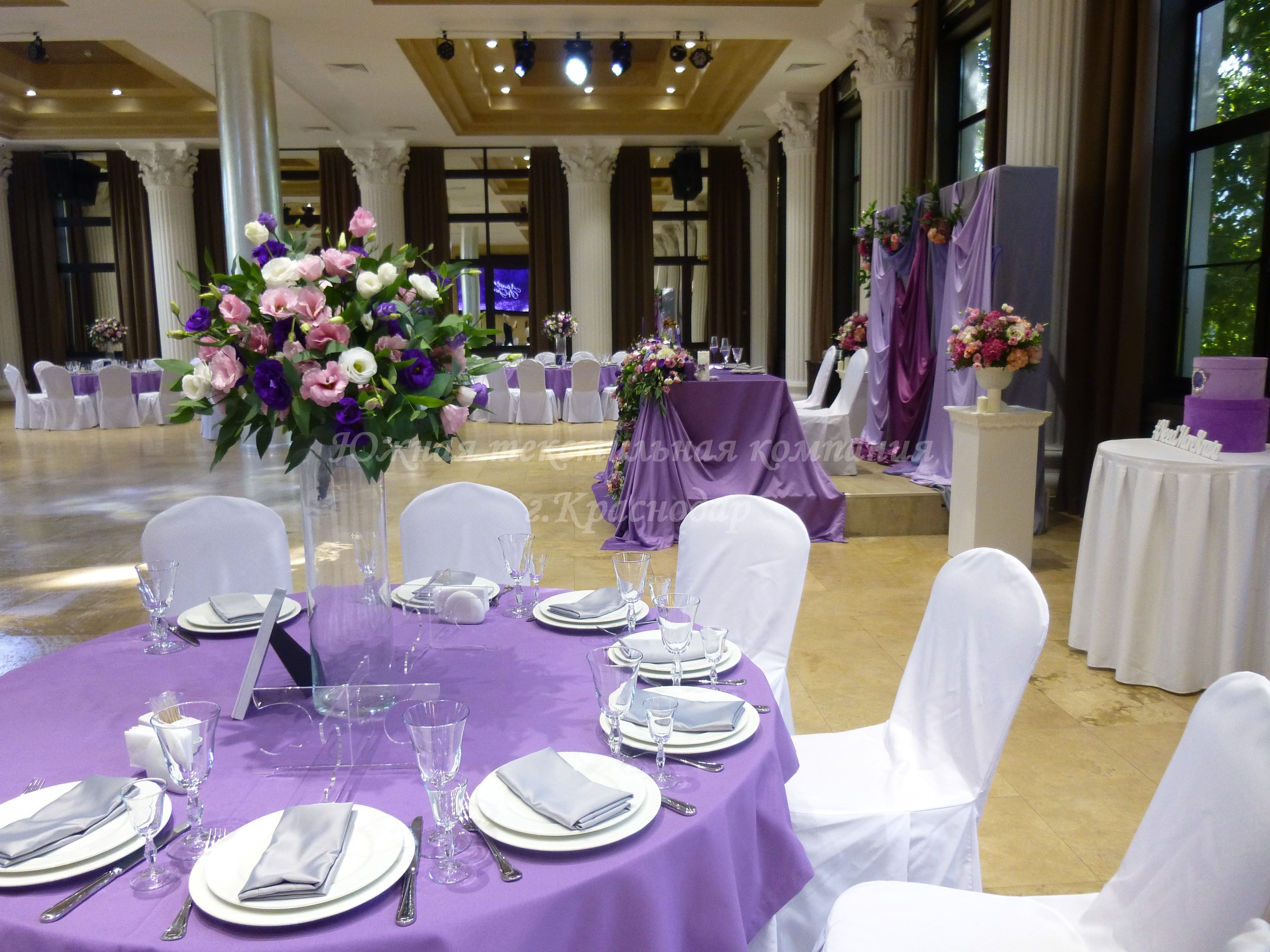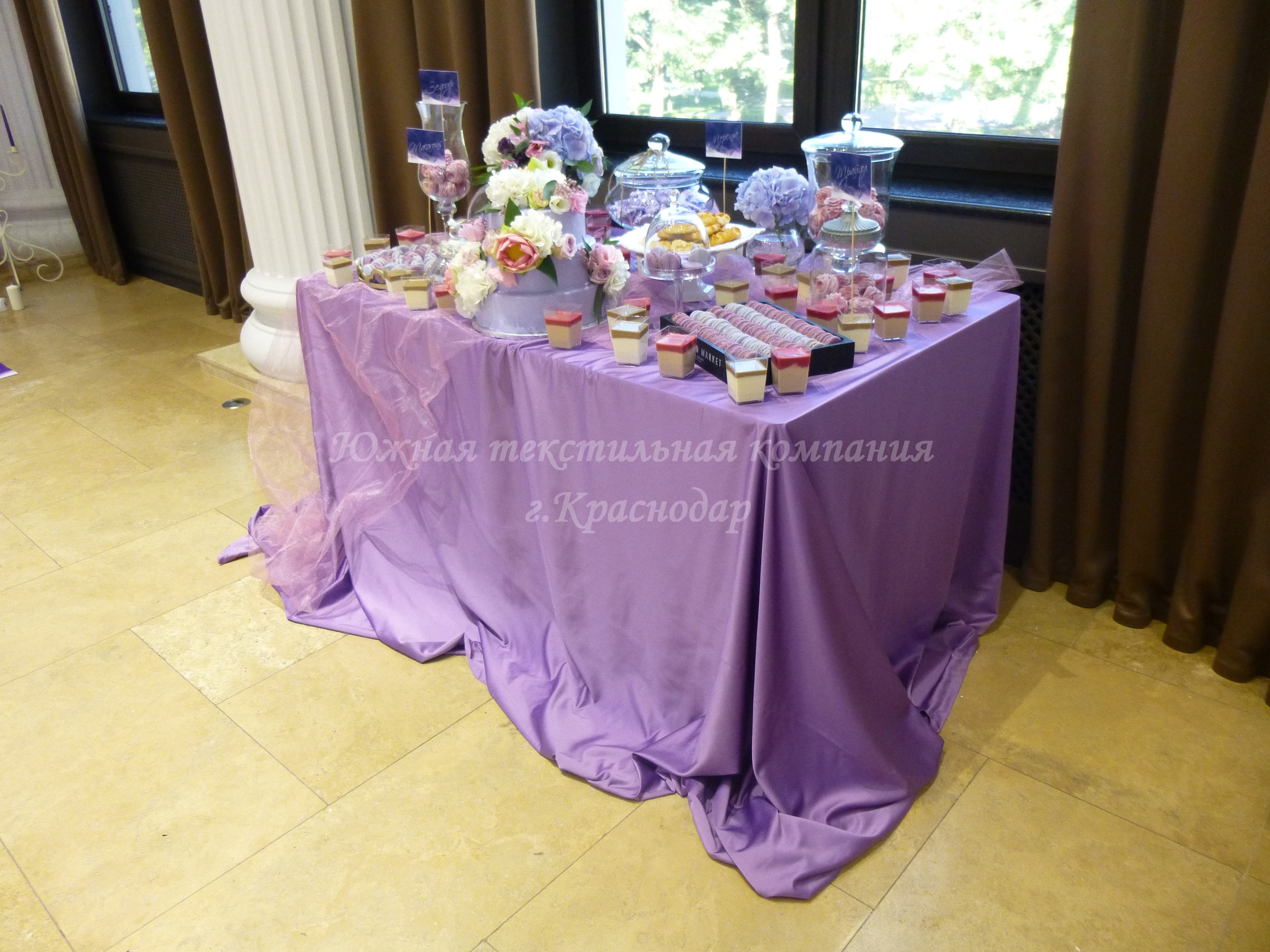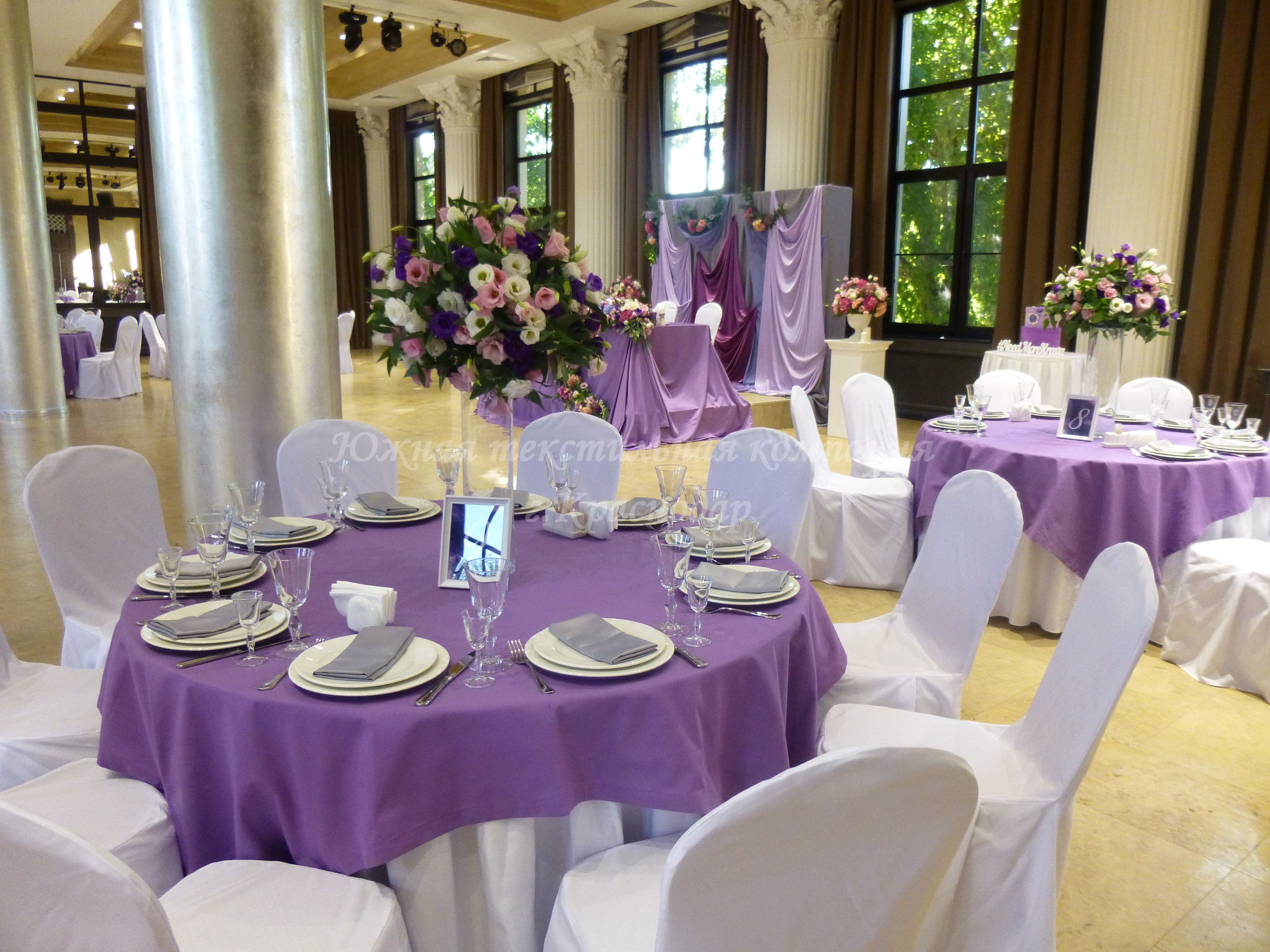 Круглые столы накрыты квадратными наперонами из испанской ткани Canvas. Стол молодожёнов и кэндибар накрыты скатертями из ткани Сатен, производство Турция. В дополнение к сиреневым скатертям сшили из того же турецкого Сатена салфетки, но уже серого цвета. Отличные цвета-компаньоны! Сиреневый олицетворяет собой нежность, влюблённость, утончённость, загадочность. А серый достаточно строгий цвет и придаёт комплекту серьёзности и элегантности.