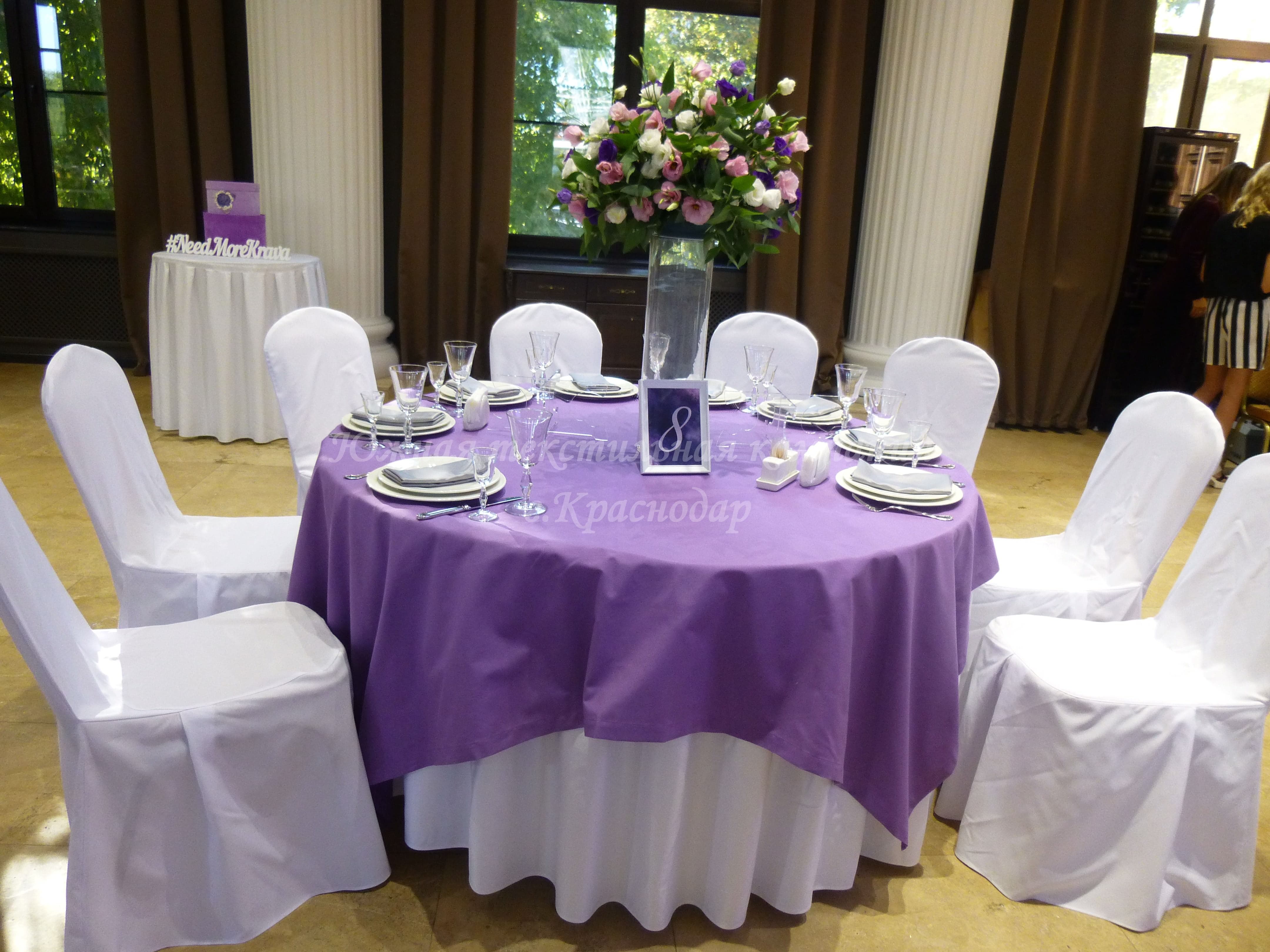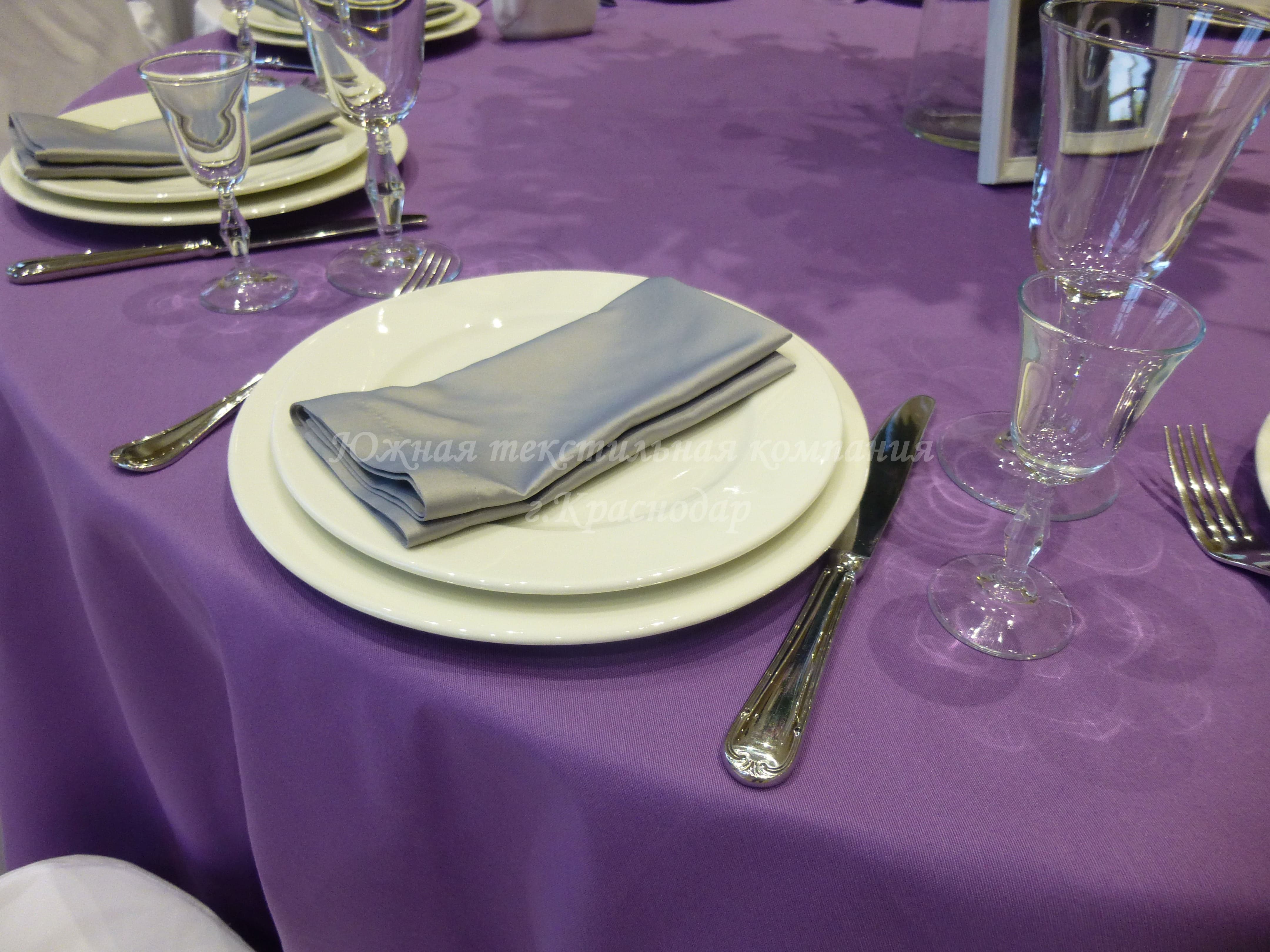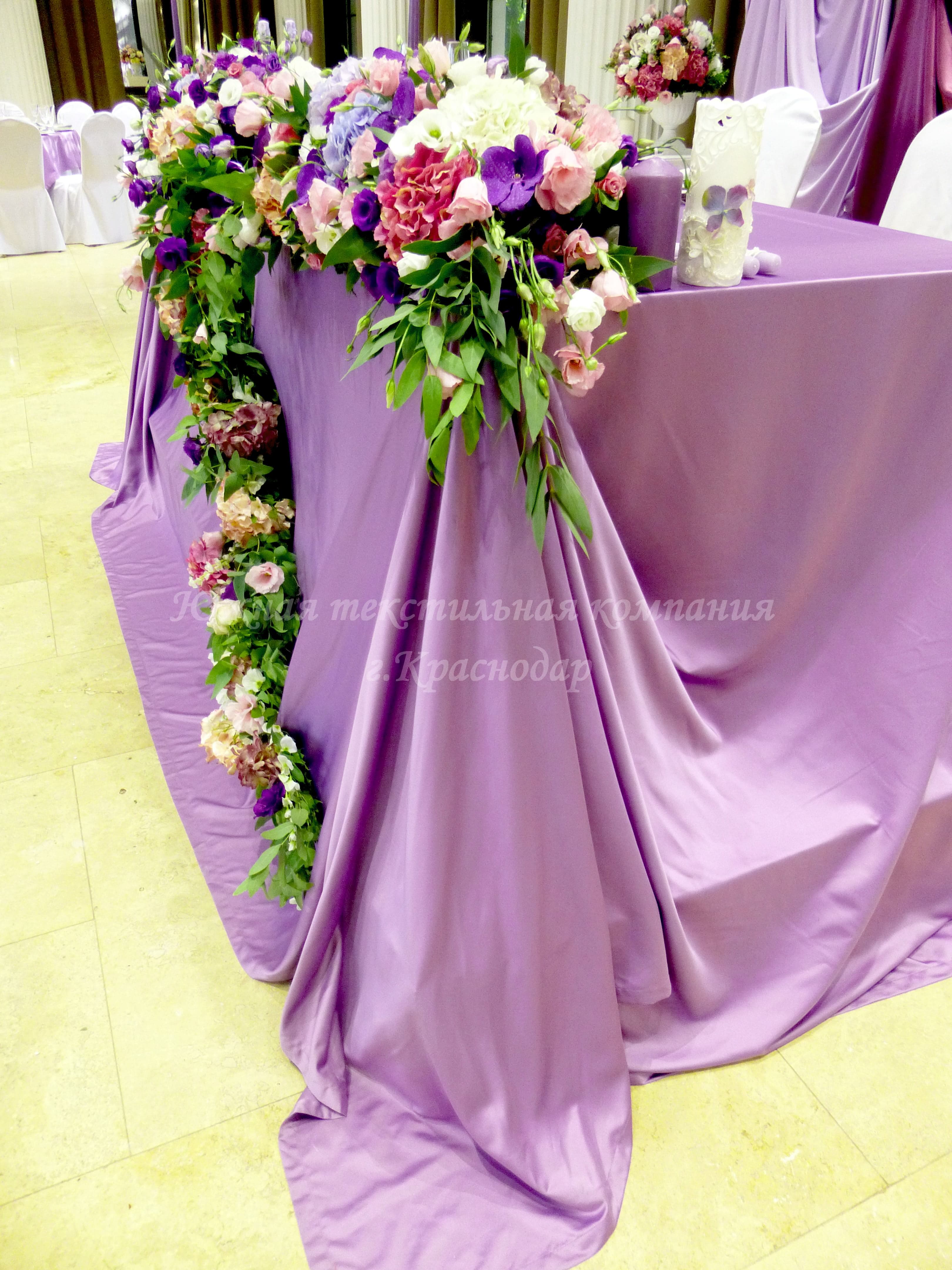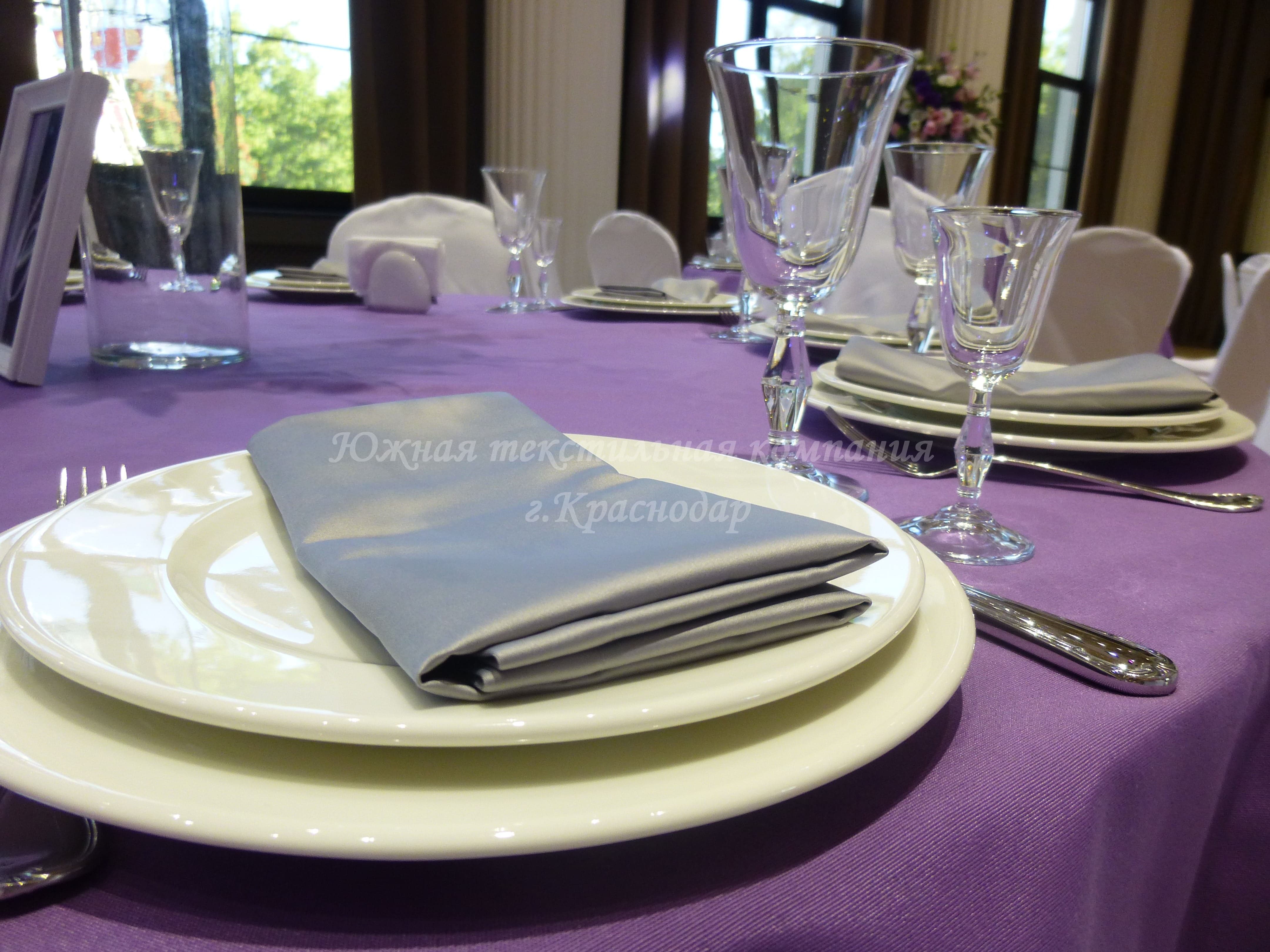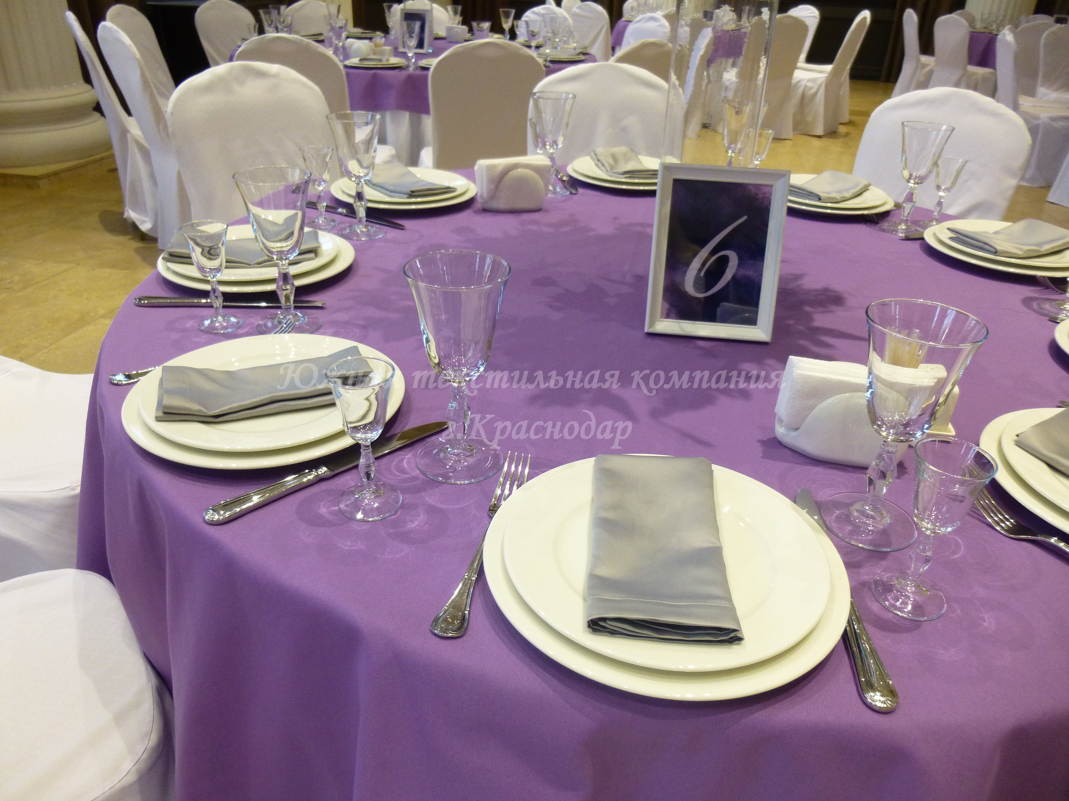 Круглые столы накрыты квадратными наперонами из испанской ткани Canvas. Стол молодожёнов и кэндибар накрыты скатертями из ткани Сатен, производство Турция. В дополнение к сиреневым скатертям сшили из того же турецкого Сатена салфетки, но уже серого цвета. Отличные цвета-компаньоны! Сиреневый олицетворяет собой нежность, влюблённость, утончённость, загадочность. А серый достаточно строгий цвет и придаёт комплекту серьёзности и элегантности.